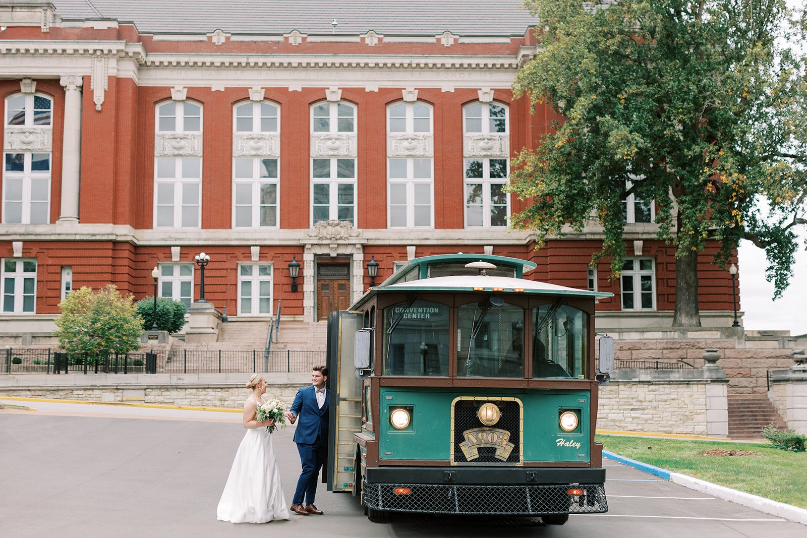 A husband and wife on their wedding day, standing at the Missouri Capitol during their bride and groom portraits. The photographer, Kiley Ann Photography, caught this image on film in Jefferson City, Missouri.